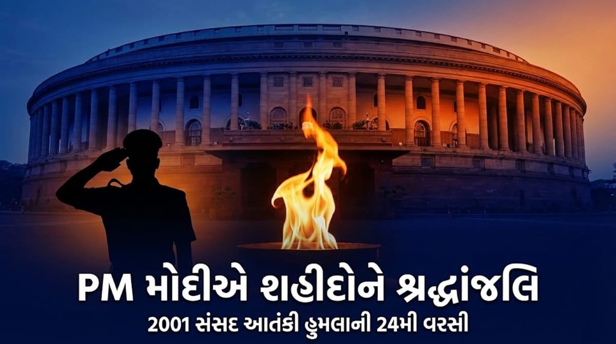 ભારત આજે આ ઘાતક આતંકી હુમલાની 24મી વરસી મનાવી રહ્યું છે. શ્રદ્ધાંજલિ સમારોહ દરમિયાન ઉપરાષ્ટ્રપતિ સી.પી. રાધાકૃષ્ણન પણ સંસદ પરિસરમાં પહોંચ્યા હતા. આ ઉપરાંત કેન્દ્રીય મંત્રીઓ કિરેન રિજિજુ, પીયૂષ ગોયલ, જિતેન્દ્ર સિંહ અને અર્જુન રામ મેઘવાલ હાજર રહ્યા હતા.