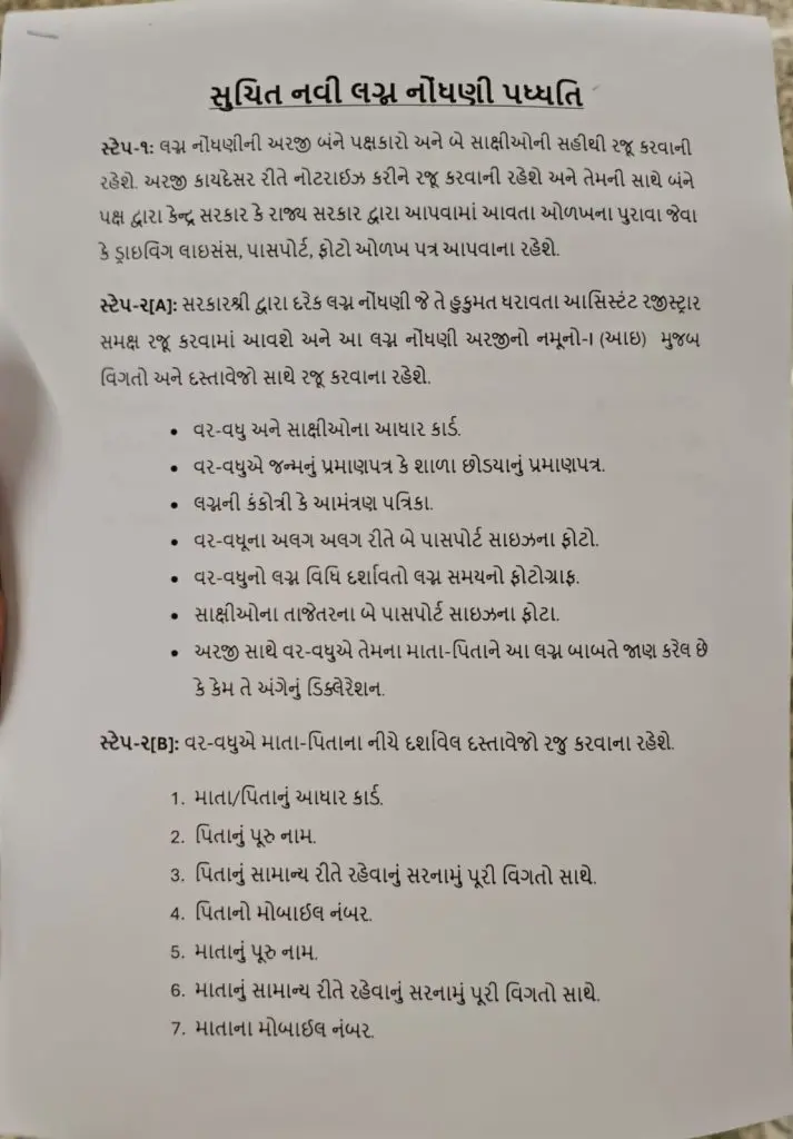 ગુજરાતમાં મેરેજ રજીસ્ટ્રેશન માટે ઓનલાઈન સુવિધા ઉપલબ્ધ છે. અરજી કરવા માટે પહેલા સંબંધિત મ્યુનિસિપલ કોર્પોરેશન અથવા સ્થાનિક શાસન સંસ્થાની ઓફિશિયલ વેબસાઈટ પર જઈ ‘Marriage Registration’ વિભાગમાં ફોર્મ ભરવું પડે છે. ત્યારબાદ જરૂરી ડોક્યુમેન્ટ્સ સ્કેન કરીને અપલોડ કરવાના હોય છે. ફોર્મ સબમિટ કર્યા પછી તેની પ્રિન્ટ રાખવી જરૂરી રહે છે અને ઘણી વખત અંતિમ વેરિફિકેશન માટે દંપતીએ રજીસ્ટ્રાર કચેરીએ હાજર રહેવું પડે છે.