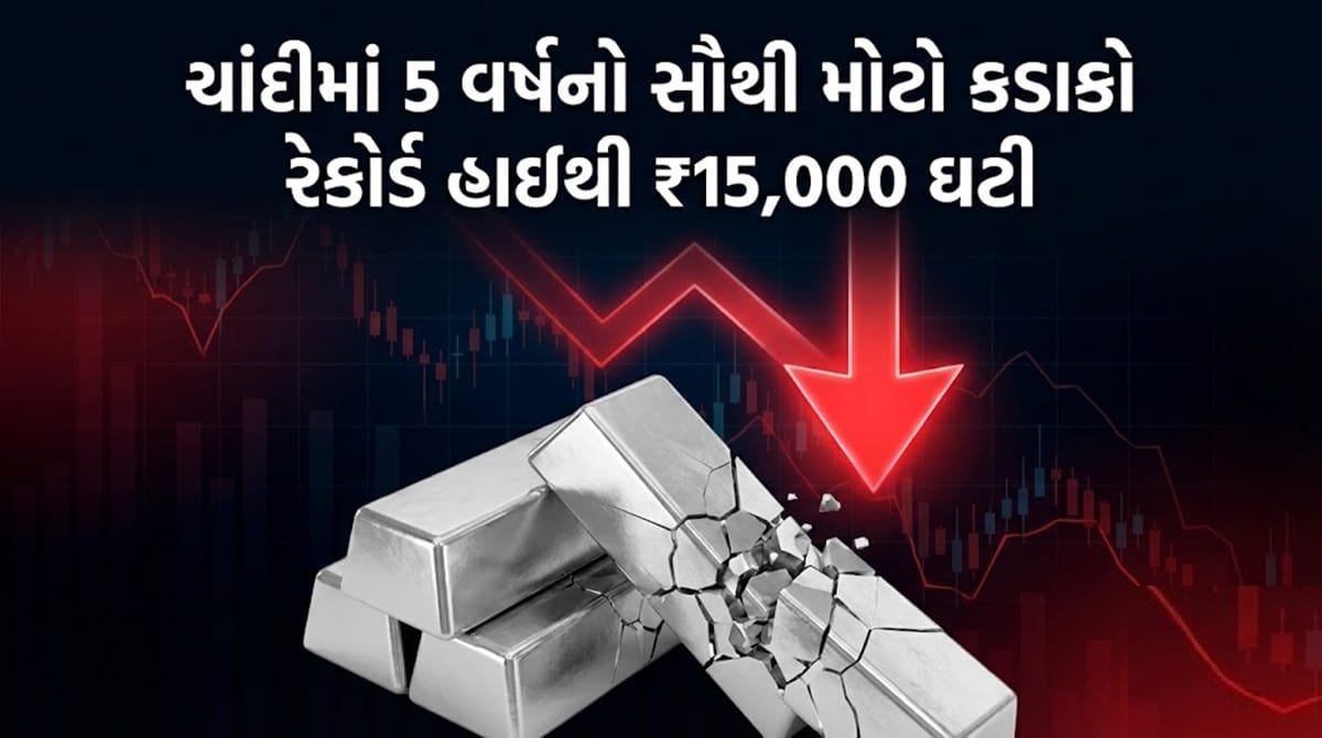 Silver Price Crash: ચાંદીમાં 5 વર્ષનો સૌથી મોટો કડાકો જોવા મળ્યો છે. રેકોર્ડ હાઇથી ₹15,000ના ઘટાડા બાદ રોકાણકારોમાં ચિંતા, જાણો ભાવ કેમ તૂટ્યા અને આગળ શું સંકેત છે.
