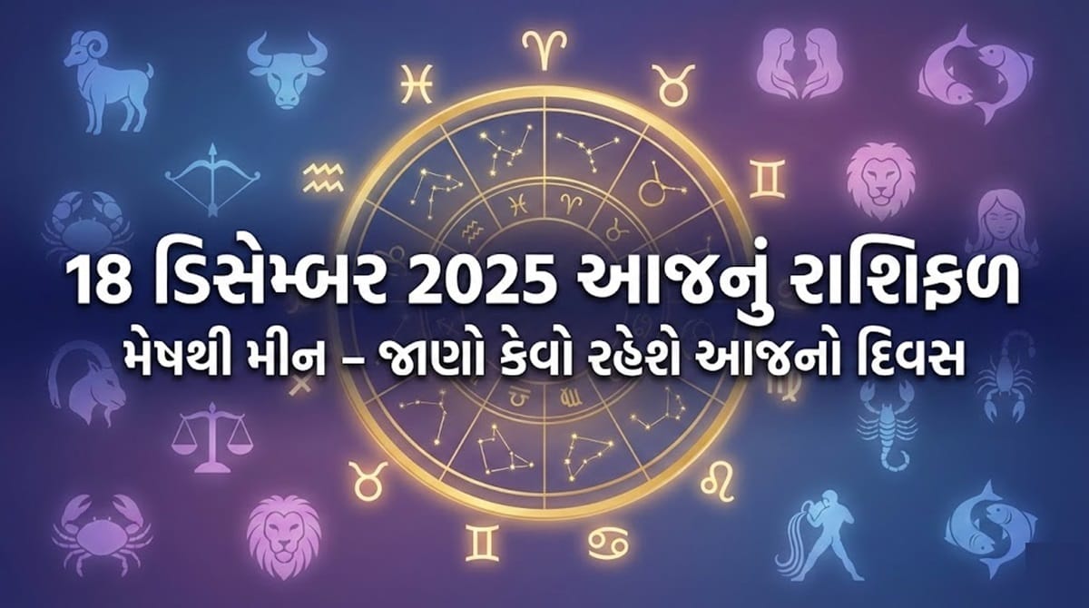 18 ડિસેમ્બર 2025 આજનું રાશિફળ વાંચો. મેષથી મીન સુધી તમામ રાશિઓ માટે નોકરી, ધંધો, પ્રેમ, નાણાં અને આરોગ્ય વિશે વિગતવાર ભવિષ્યફળ.